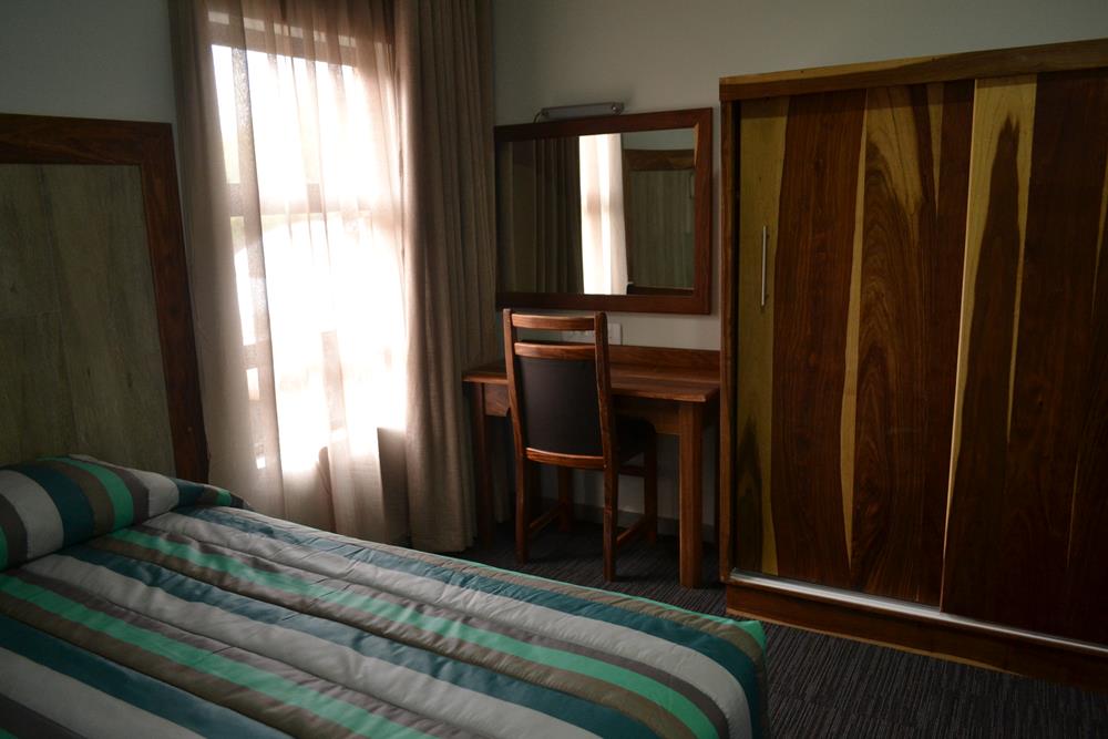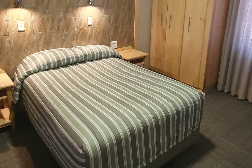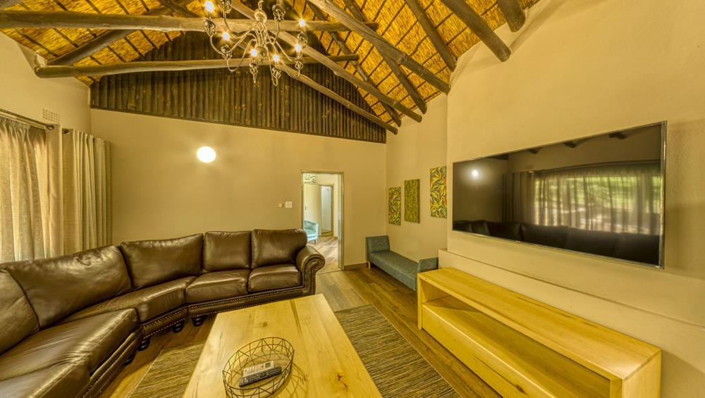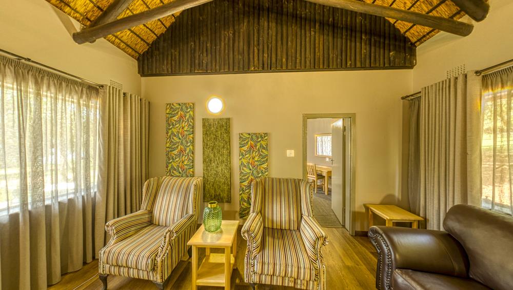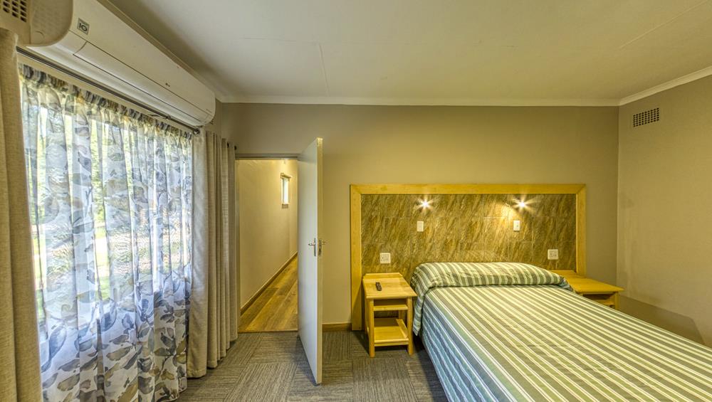 2 bedroom / 4 sleeper chalet: Main Room: 1 x double bed with en-suite bathroom with a bath, shower, basin and toilet. 2nd Room:1Single bed and 1 x bunk bed set with en-suite bathroom with a shower, basin and toilet. Kitchen fully equipped with basic crockery and cutlery (for 5 people), cooking utensils, stove, fridge and microwave. Lounge with a TV (16 selected DSTV channels), Air-Conditioner and Braai area. Max 5 people. Top bunk for child under 12.