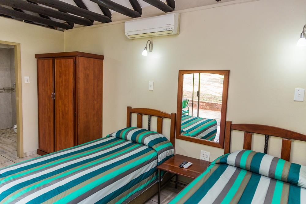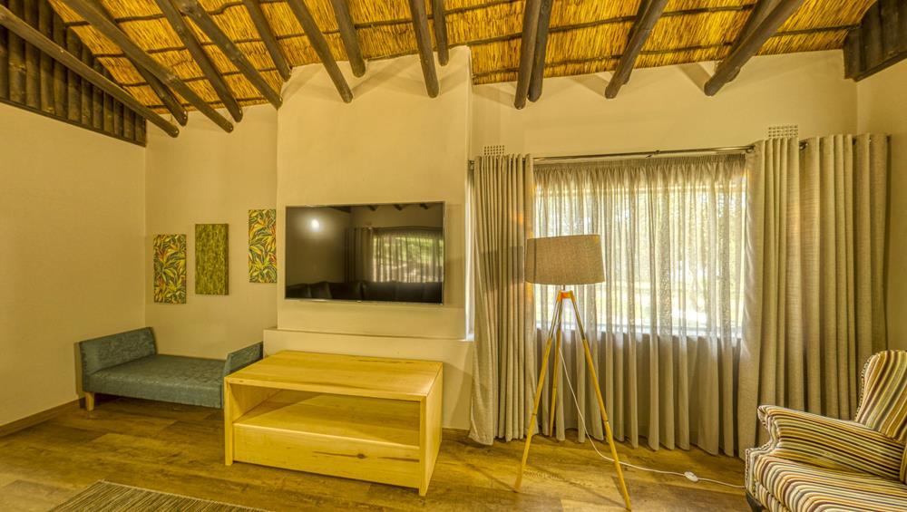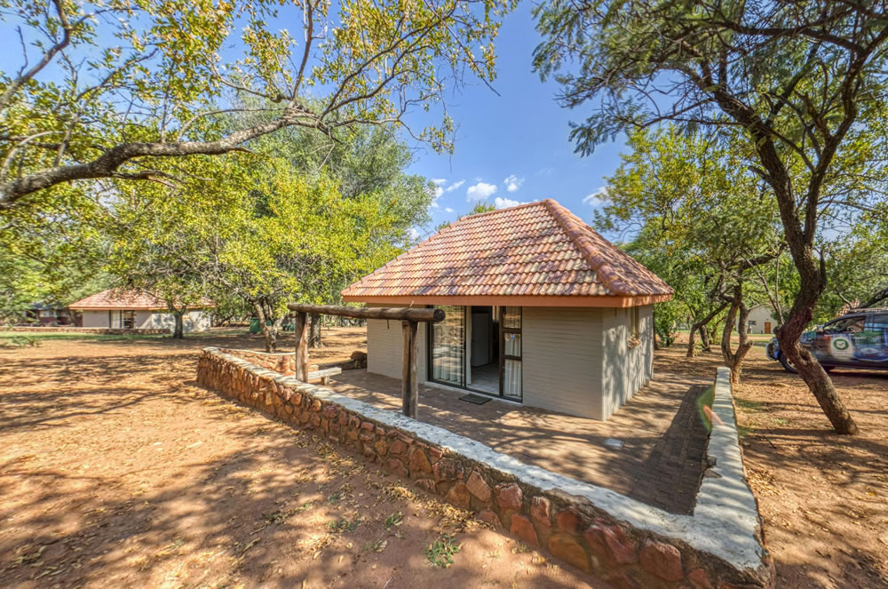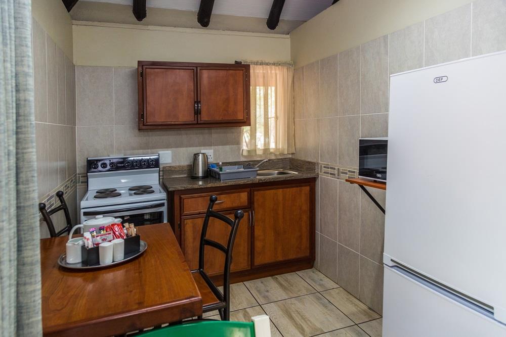 Open plan / 2 sleeper chalet. Open plan chalet with 2 x single beds, open plan kitchen fully equipped with basic crockery and cutlery (for 2 people), cooking utensils, stove, oven, fridge and microwave. Bathroom with a shower. TV (16 selected DSTV Channels), Air-Conditioner and Braai area. Max 2 people.