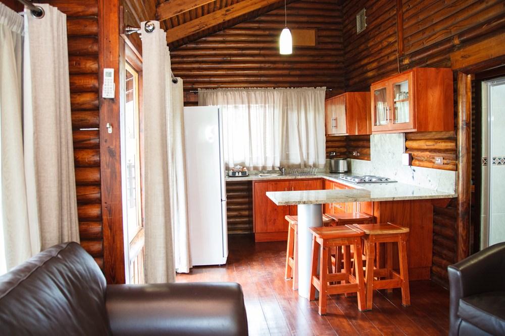 1 bedroom / 2 sleeper log cabin: Main Room: 1 x double bed. Bathroom with a bath, shower and basin. Separate toilet. Kitchen fully equipped with basic crockery and cutlery (for 2 people), cooking tensils, stove, fridge and microwave. Lounge with a TV (16 selected DSTV Channels), Air-Conditioner and Braai area. Max 2 people.